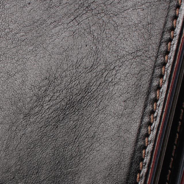 本体素材には、ベジタブルタンニンで鞣されたイタリア産ショルダー革を使用しています。ショルダー革(成牛の首部分の革)の独特の深い”トラ”(筋シワ)がポイントで、ピット層にじっくりと漬け込む製法で鞣し、さらにプレスをかけ、革本来のツヤ感を表現しています。