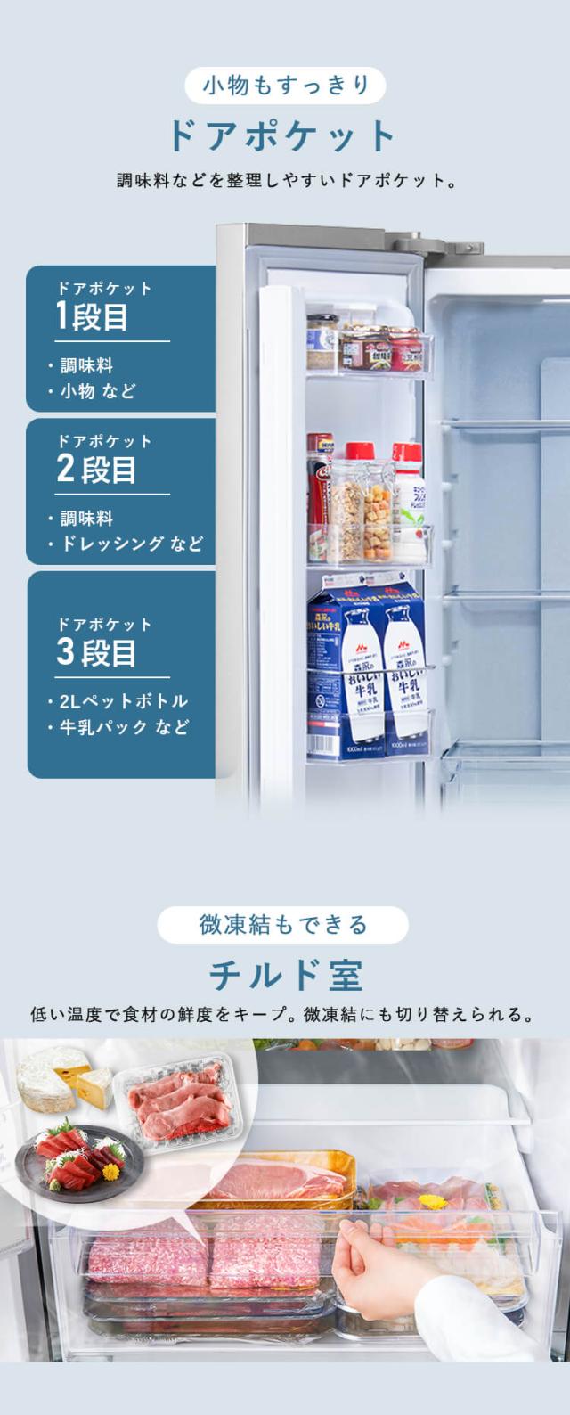 - 二段目、三段目共に冷凍室でなので、冷凍はたっぷりと入ります。野菜室が無いのはちょっと残念ですが…両開きなので、ドアポケットの収納性がちよっと少ないと感じます。