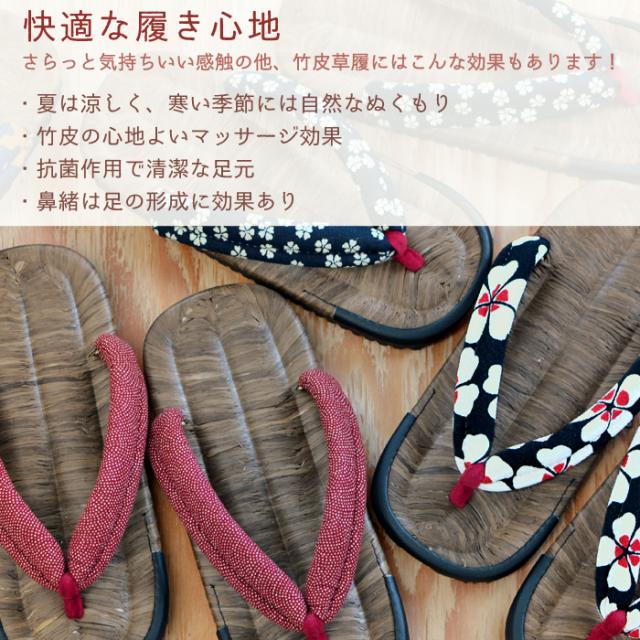 天然の竹を編んでつくられた竹皮の下駄。 表はさらっと快適な履き心地です。 良質な竹皮を伝統の草木染めで仕上げた烏(からす)表。 二石鼻緒は芯材を使わず幅広で足に優しい履き心地です。 底は耐久性のある、本物のラジアルタイヤ素材を使用しております。 クッション製に優れるだけでなく、滑りにくくとても履きやすい日本製の雪駄です。 ■ブランド:竹春(TAKEHARU) ■生産地:日本 ■素材: [表]竹皮 [底]ラジアルタイヤ(ゴム)底 [鼻緒]綿 ■重量(片足で計測):(約)M150g、L165g 桐や竹皮の質量により若干個体差がございます。 ■適応サイズ(目安) M:22.5〜23.5cm L:24.0〜25.0cm 実寸サイズにつきましては画像をご確認ください。 下駄はフリーサイズとなりますので、表記している適応サイズは目安となります。 【サイズについて】 履き始めは鼻緒が窮屈に感じられますが、履き込むほど鼻緒が程よく伸び、足に馴染んできます。 雪駄は本来、かかとを少し出して履くのが一般的な履き方とされております。 履いていてかかとが痛くないほどの出方がちょうど良いサイズです。 【長く使うためのコツ】 左右がありませんので、時々左右を履き替えて頂くと長持ちします。 <ご注意> 以下をご確認いただき、予めご了承くださいませ。 天然の桐、竹皮を使用し、日本国内で製造されたものです。 ※一点一点手作りの商品となりますので、写真と実際お届けする商品には若干見た目(お色味等)が異なる場合がございます。 ・商品は防水されておりません。カビなどの原因となりますので、雨天時はご使用をお控えください。 |