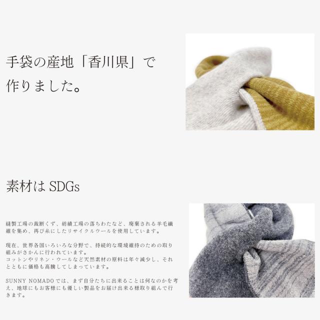 ![]() ■SUNNY NOMADO サニーノマド 商品詳細 SUNNY NOMADO サニーノマドから シルクと麻の香川産ショートマフラーが登場しました。 肌に触れる素材は綿麻とシルク。 暖かくて、快適な着け心地。 柔らかいコットンに、リネンとラミー、 そしてシルクをブレンド。 暖かさはもちろん、蒸れを抑えるなど着け心地を快適にしてくれます。 Linen = 亜麻(あま) 繊維に含まれるペクチンは汚れがつきにくく、さらに抗菌防臭の機能も持っています。 中が空洞構造で、 そこに暖かい空気を閉じ込めます。 Ramie = 苧麻(ちょま ) シャリ感があり、汗ばんでも肌に密着せずベトつきにくい特徴があります。 汗を素早く吸収、 放出する性質が、首元の湿気を逃します。 silk = 絹 繊維の間に空気をたくさん含む事ができるので外の暑さ・寒さに影響されにくく、快適に保ちます。 吸湿性にも富んでいるので、 静電気は起こりにくいです。 結ばず、通すだけ。 スリットが入っているので、そこに通すだけで首元にホールドできます。 結び目ができない為、 胸元がすっきりした印象になります。 持ち運びに便利。 かさばらないのでお出かけの際気軽にバックに入れて持ち運べます。 夕方からの冷え込みに備えてもっていきたい時、電車やオフィスの中でちょっと外したい時に便利です。 手袋の産地 「香川県」で作りました。 素材は SDGs 縫製工場の裁断くず、 紡績工場の落ちわたなど、 廃棄される羊毛繊維を集め、 再び糸にしたリサイクルウールを使用しています。 現在、世界各国いろいろな分野で、 持続的な環境維持のための取り組みがさかんに行われています。 コットンやリネン・ウールなど天然素材の原料は年々減少し、それとともに価格も高騰してしまっています。 SUNNY NOMADO では、 まず自分たちに出来ることは何なのかを考え、地球にもお客様にも優しい製品をお届け出来る様取り組んで行きます。 |
