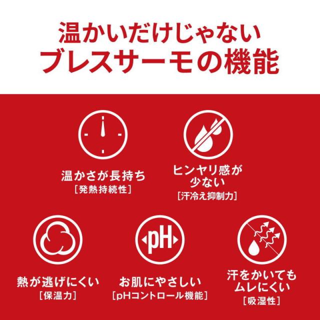 | 特徴 | 保温性の高い素材で、腰の冷えを防止。 冷えやすい部位を1枚であたためます。 冬には持っておきたい一品。 お腹や腰の冷え対策に。 ステイホームにも最適。 吸湿発熱素材『 ブレスサーモ 』は、 人体から発生する水分を吸収し発熱する、快適な保温素材です。 幅広いシーズンでの着用が可能。 スポーツシーンはもちろん普段使いでもおすすめ。 |