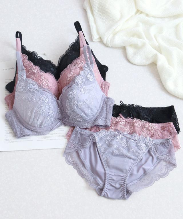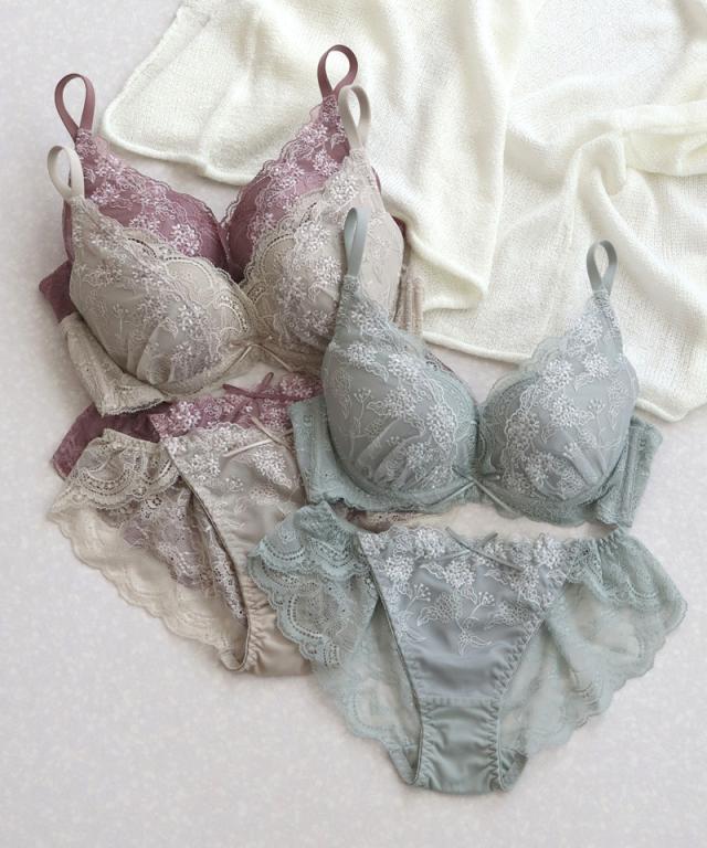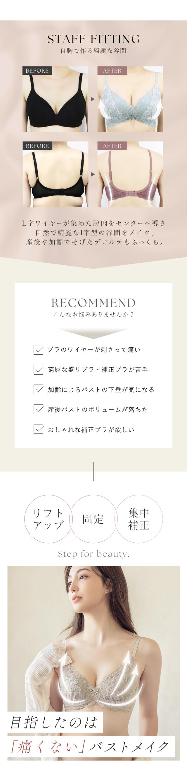 独自のL字ワイヤー搭載の痛くない脇高ブラで、しっかり脇肉補正。補正下着に見えないかわいいレースデザインで誰もがうっとりする谷間をメイク!ショーツは選べる2タイプ♪