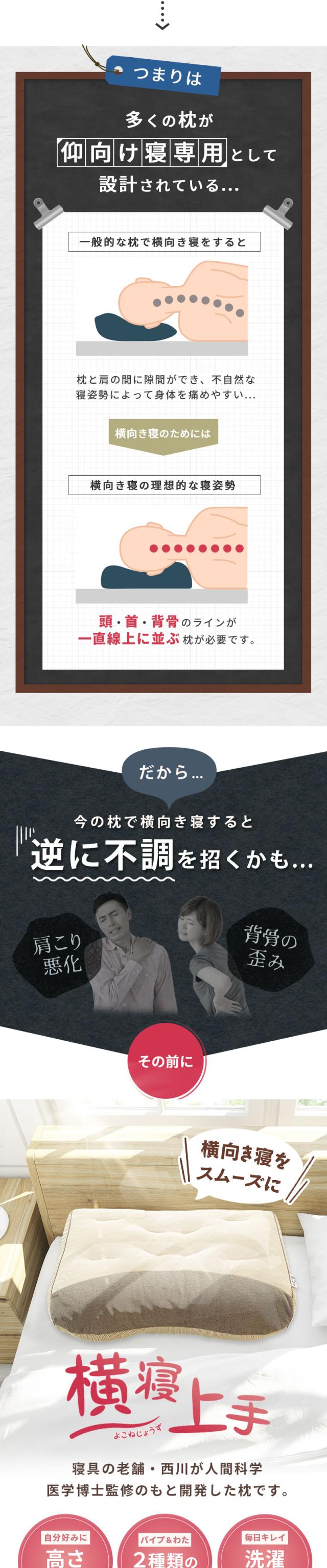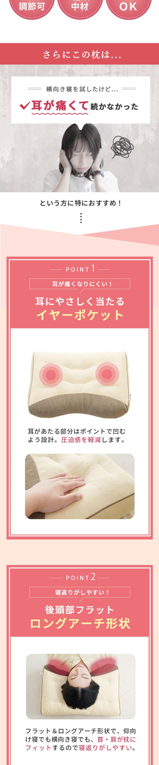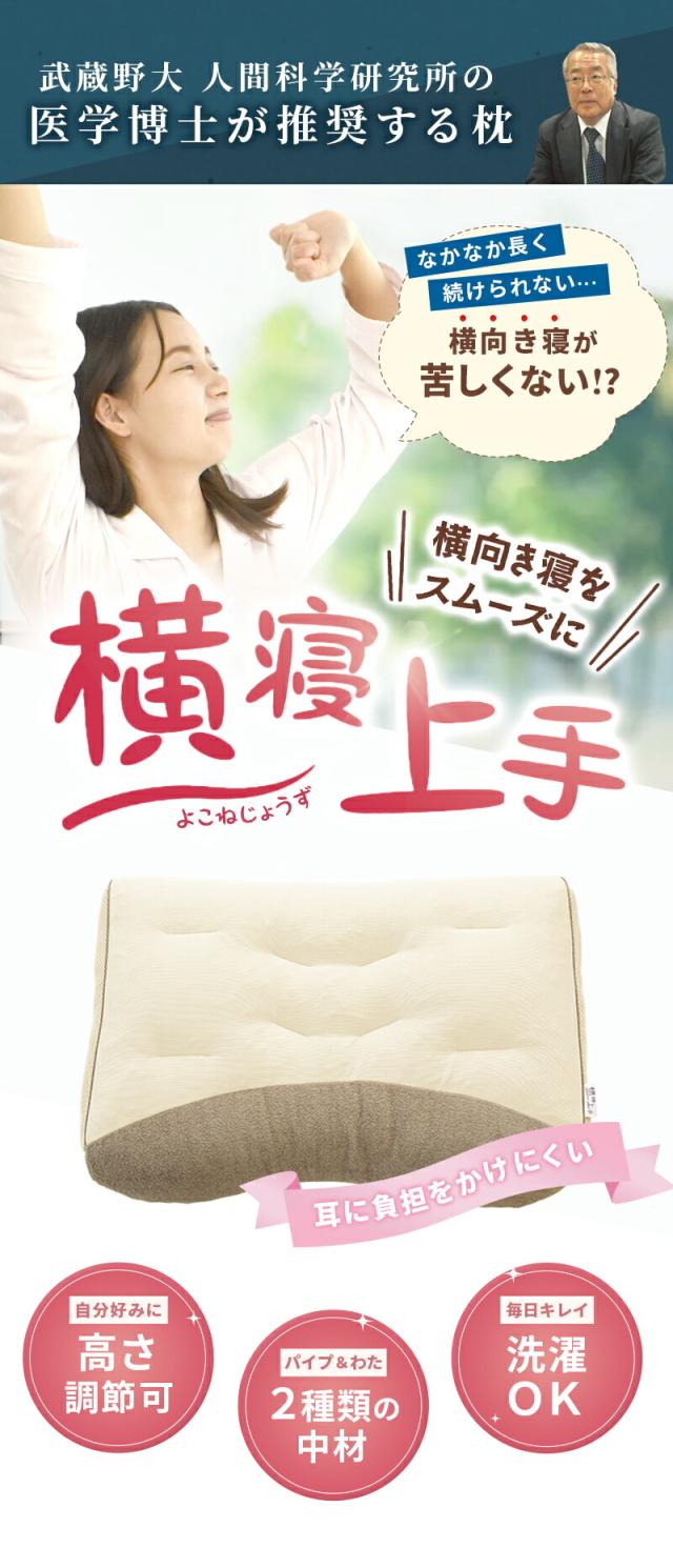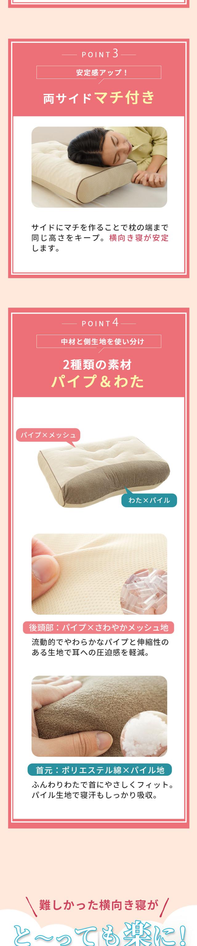 ・耳に負担をかけにくい 耳にやさしいイヤーポケット仕様。流動的でやわらかなパイプと、伸縮性のある生地が耳にやさしくフィット。横向き寝の耳への圧迫感を軽減します。 ・横向き寝が安定一般的なわた枕は、中央部にボリュームがあり、端にいくほど低くなっているため横向き寝が安定しづらい形状でした。横寝上手枕は、サイドにマチを作ることでまくらの端まで同じ高さをキープ。横向き寝が安定します。 ・寝返りがしやすいロングアーチ形状で、仰向け寝も横向き寝も首・肩にまくらがフィット!寝返りもしやすく、横向き寝だけでなく仰向け寝でも充分お使いいただけます。 ----------------------------------------- |