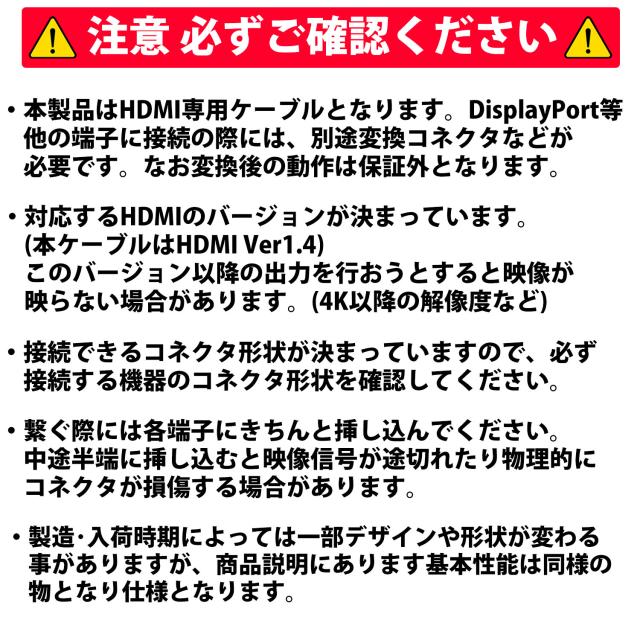 ・本製品はHDMI専用ケーブルとなります。DisplayPort等他の端子に接続の際には、別途変換コネクタなどが必要です。なお変換後の動作は保証外となります。