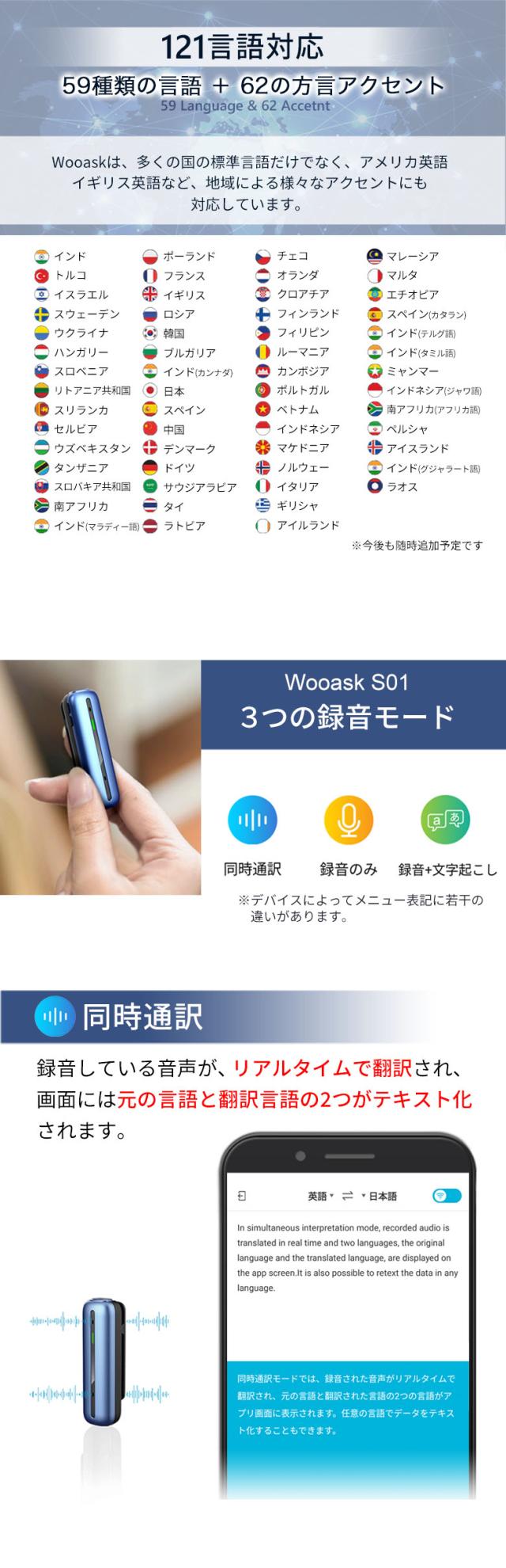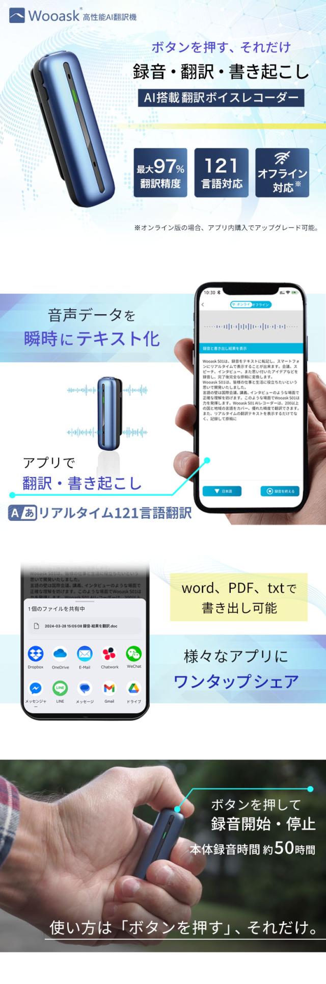 翻訳機 ボイスレコーダー 書き起こし 文字起こし Wooask S01 Plus ウーアスク オフライン対応モデル AI翻訳機 Bluetooth 通訳 英語 日本語 韓国語 中国語 フランス語 ドイツ語 イタリア語 ロシア語 ビジネス 旅行