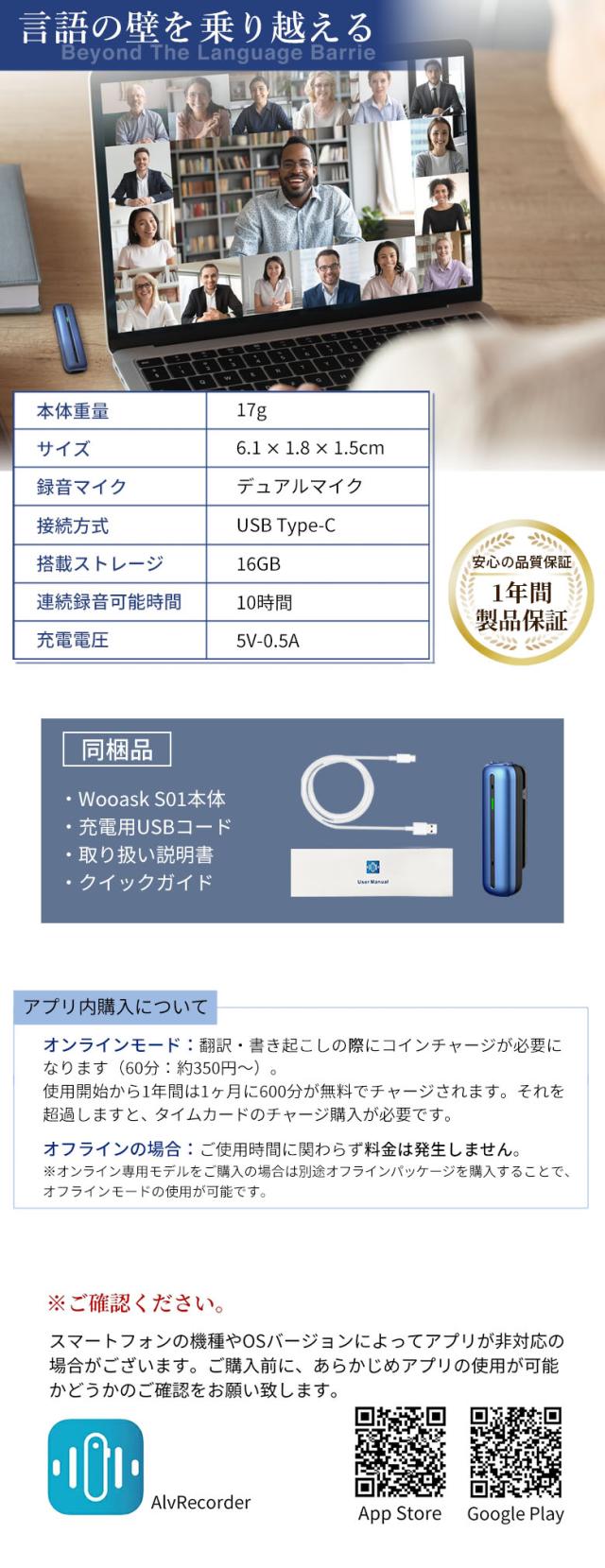 ※S01本体での録音(スタンドアローン機能)を使用した音声の書き起こし・翻訳はオンラインのみとなります。