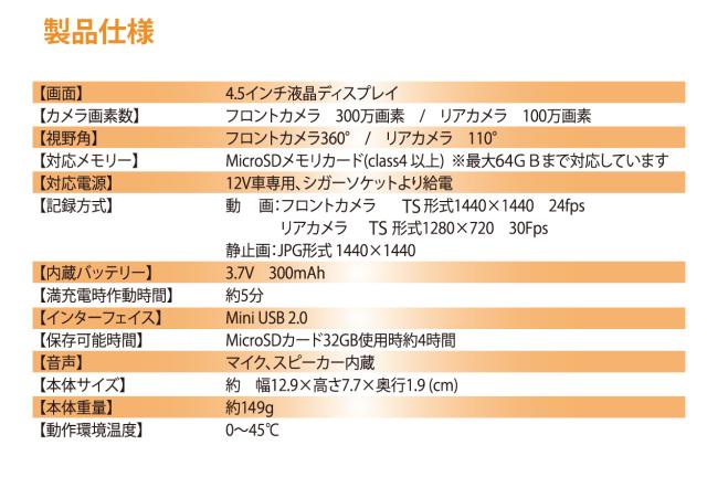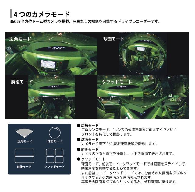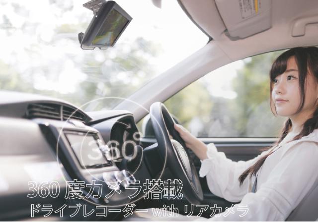 ・視野角:水平360°/垂直220°(カメラを下向きにした場合) リア 90°(1280×720 30FPS)