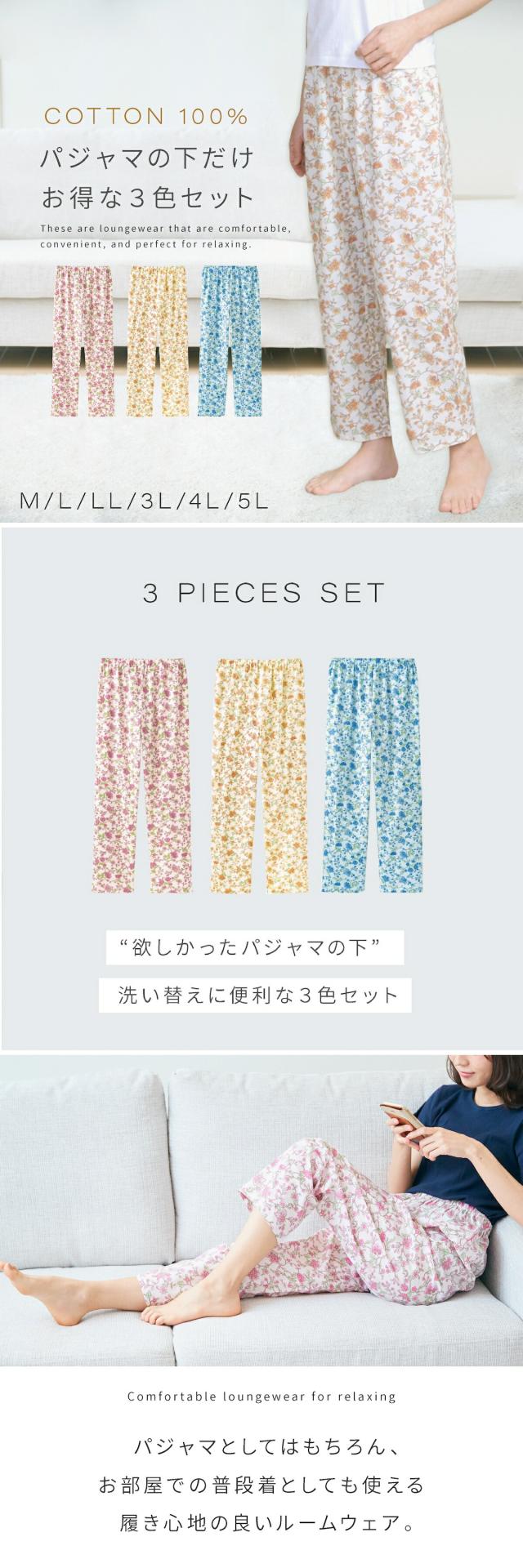 欲しかったパジャマの下 3色組 パジャマ 下だけ 大きいサイズ レディース 花柄 部屋着 綿 洗い替え パジャマのズボン ズボン パンツ 下だけ ズボンだけ ズボンのみ ルームパンツ ルームウェア レディース ポケット付き ピンク イエロー ブルー 綿100% 天然素材
