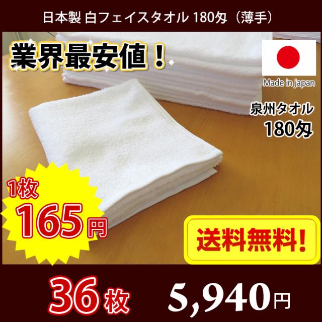 【送料無料】業界最安値! 36枚セット 日本製 泉州 白タオル 薄手 180匁 / タオル 普通のタオル 白いタオル 業務用タオル フェイス 白 ホワイト 業務用 洗車 理髪店 掃除 雑巾 まとめ買い 国産