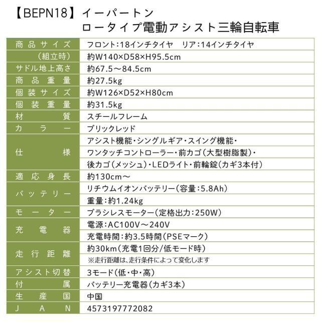 電動アシスト自転車 ロータイプ 三輪 18インチ リア 14インチ イーパートン e-parton BEPN18 正規店 ミムゴ 電動三輪自転車 自転車 三輪車 シニア 高齢者 主婦 買い物 快適 スイング機能 安全 転ばない かご付き 前後かご メーカー直送