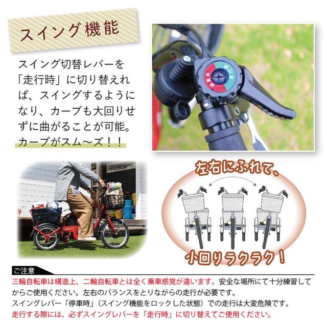 従来のサイズよりも、一回り小さくすることで両足が地面に着き、小柄な方やシニア世代にも、無理なく安心して乗っていただける三輪自転車です!