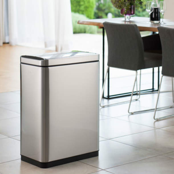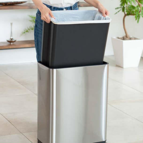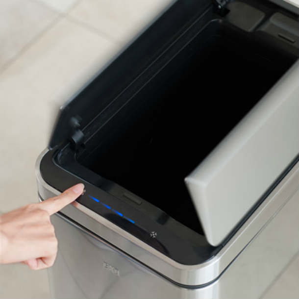大人気シリーズに電動式が新登場。 フタが両開きなので、高さ制限のある場所でも設置可能。 センサー感知によりフタが開き、自動で閉まる。 デジタルパネル両サイドのタッチボタンでも開閉可能。 LEDカウントダウン表示でフタが閉まるまでのタイミングを確認できる。 お手入れがカンタンで衛生的なプラスチックインナーボックス付。 ● 高性能アクティブセンサー搭載 ● 両開きゴミ箱 自動開閉 ● ソフトクローズ カウントダウンタイマー付き ● フィンガープリントレジスタント加工 ● 蓋付き タッチスイッチ インナーボックス付き ● バッグフィクサー付き サイズ:幅252×奥行377×高さ620mm 重量:6.1kg 材質:ステンレススチール、ポリプロピレン、ABS樹脂 電源:アルカリ単3電池×6本使用(別売) |