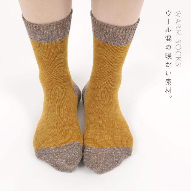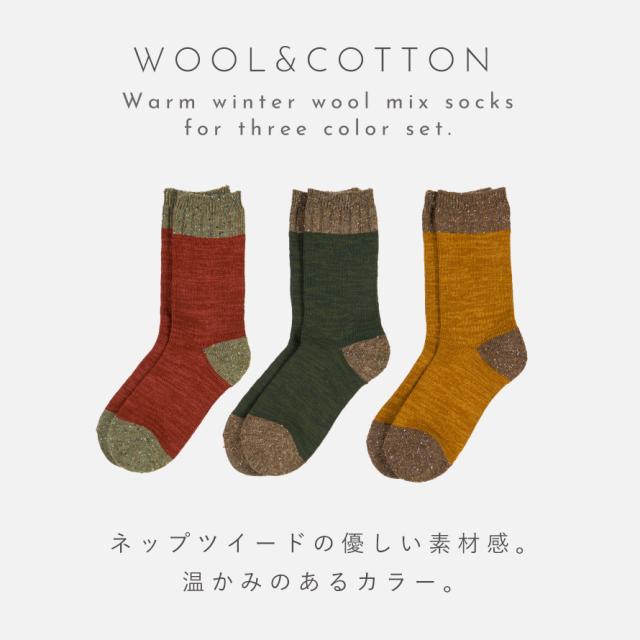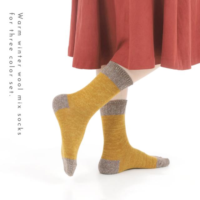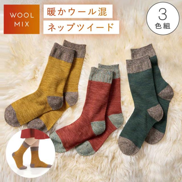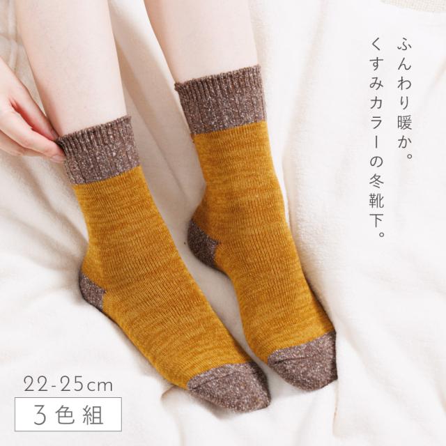 靴下 レディース 冬 暖かい 【3色組】 22-25cm 秋冬 バイカラー 切り替え おしゃれ 長め 【 ウール混でふんわりあたたか 】 まとめ買い 3足 セット あったか ソックス かわいい 冬用 つま先 かかと 補強 あったかツイードネップお洒落ソックス