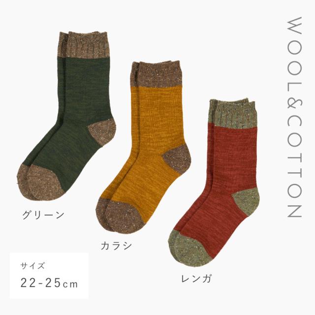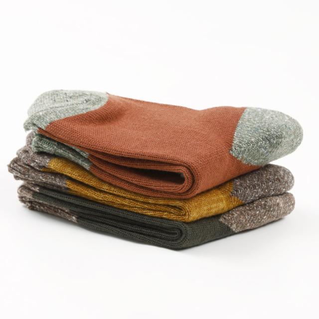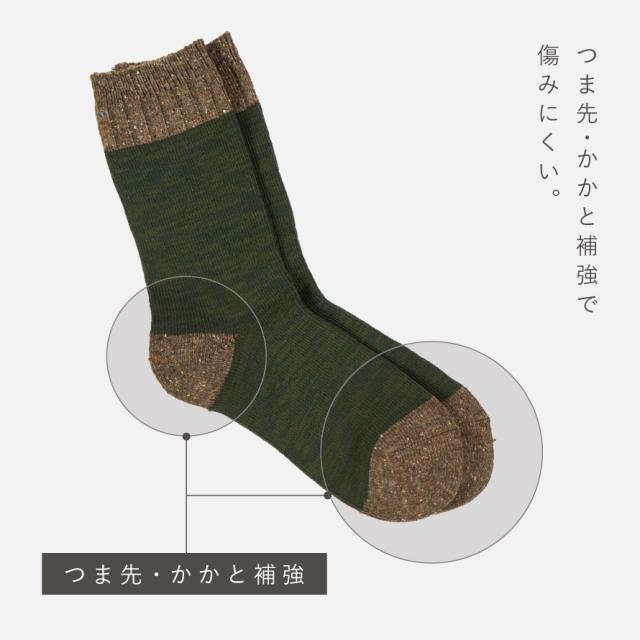 ウール混でふんわりあたたか。ネップツイードがナチュラルな素材感のカジュアルソックス。秋冬コーデと合わせてカジュアルに着こなせる、グリーン、カラシ、レンガの3色組。少しくすんだ深みのあるカラーが装いのアクセントに。