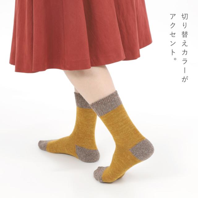 はき口・つま先・かかと部分は、切り替えカラー。粒が特徴的なネップツイード糸を使い、ざっくりとした素材感。