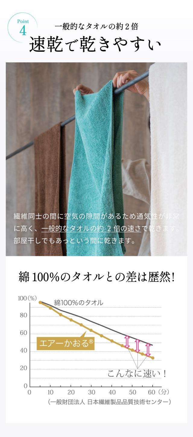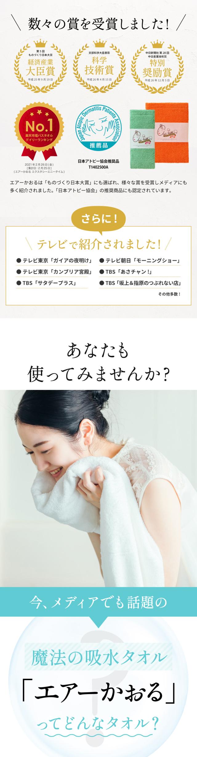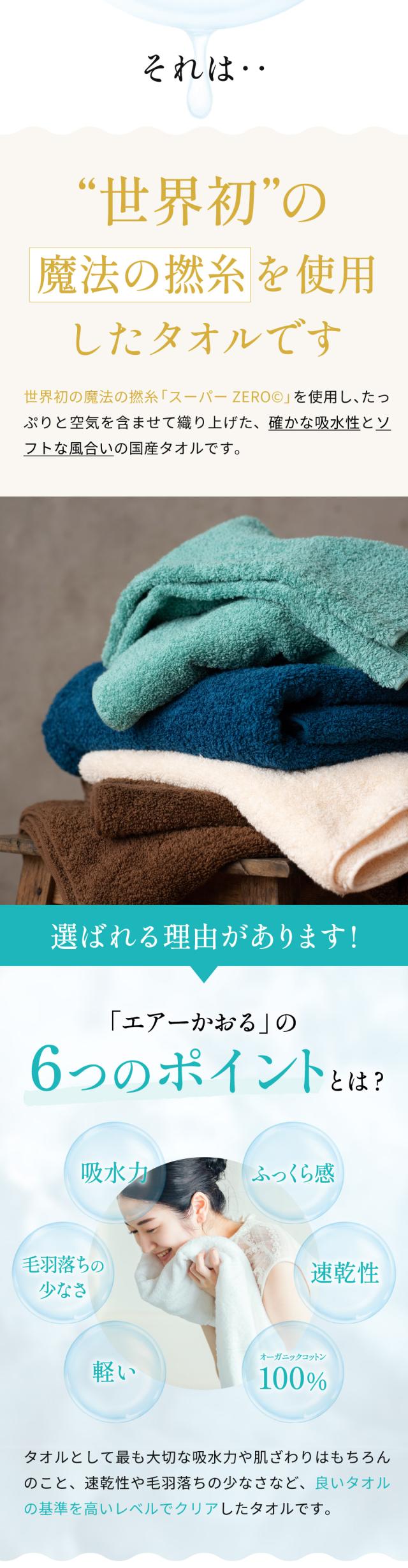 「エアーかおる」オーガニックエクスタシーは、経済産業大臣賞を受賞した、空気を取り込んで撚糸する特殊撚糸工法によって作られたタオルです。