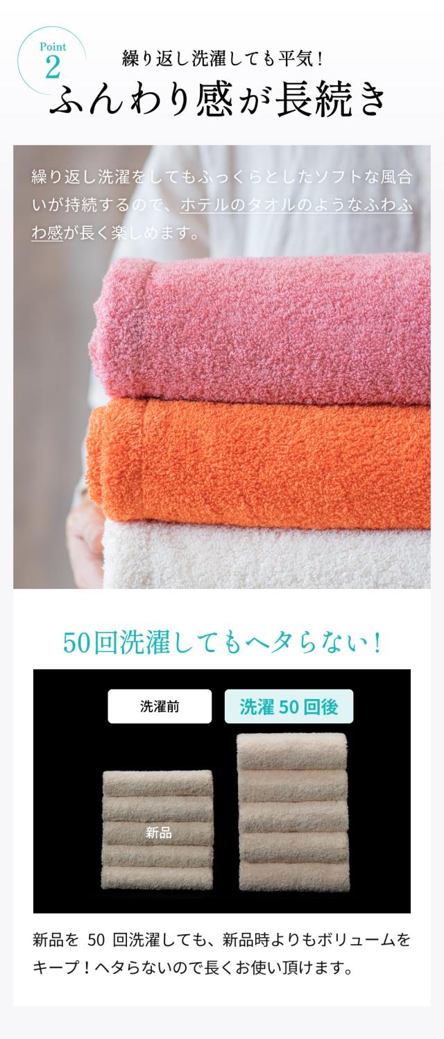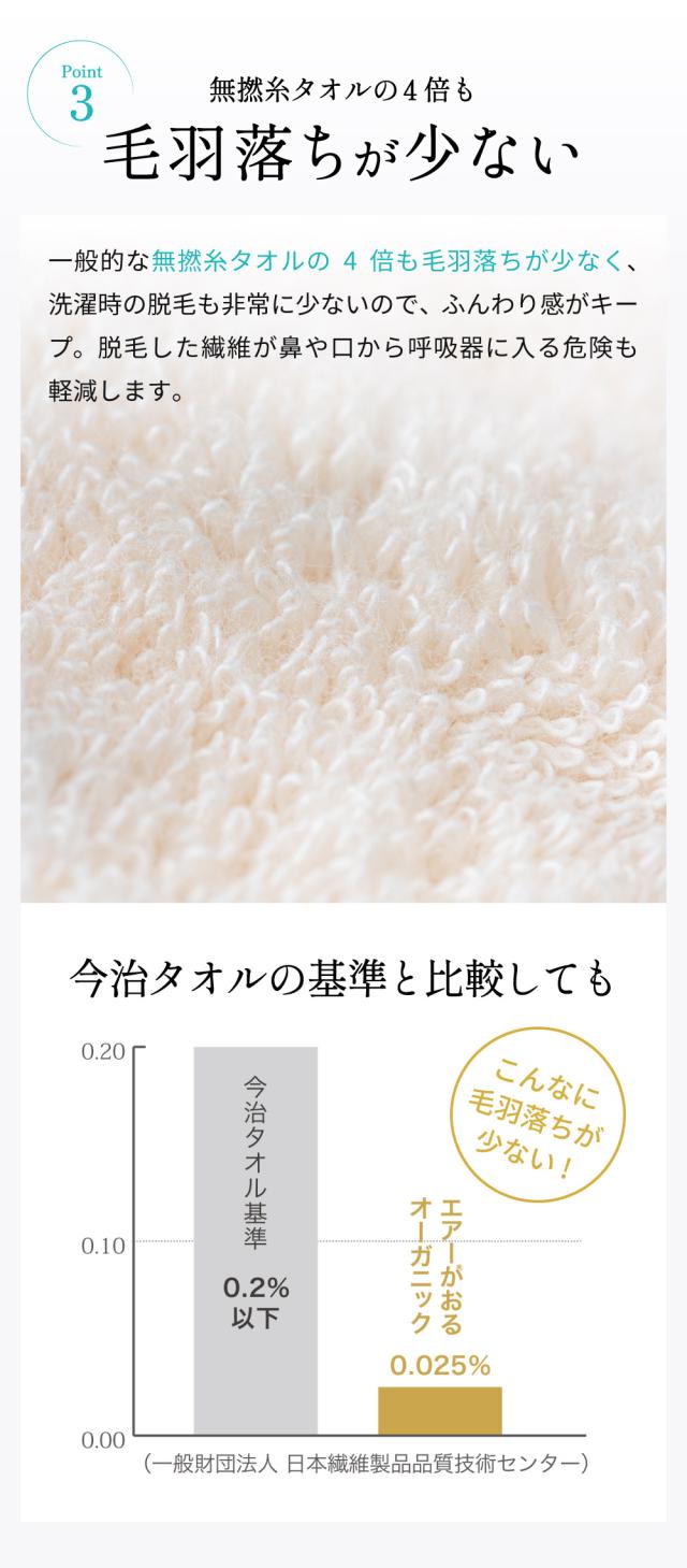 吸水性が高く、柔らかくて毛羽落ちが少なく、軽く柔らかでふっくらとしたボリューム感があります。