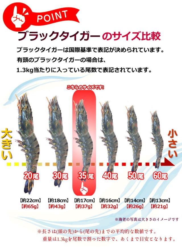 約1.3kgの中に35尾という頭付きのブラックタイガー海老となります。