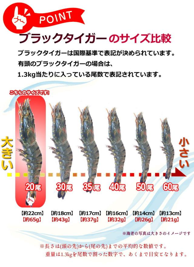 約1.3kgの中に20尾という頭付きのブラックタイガーの中ではかなり大きなサイズの海老となります。