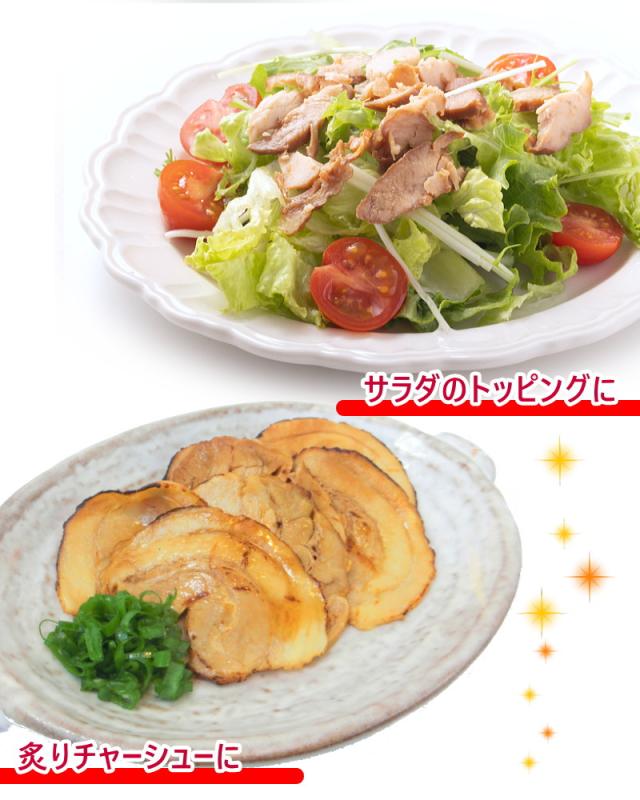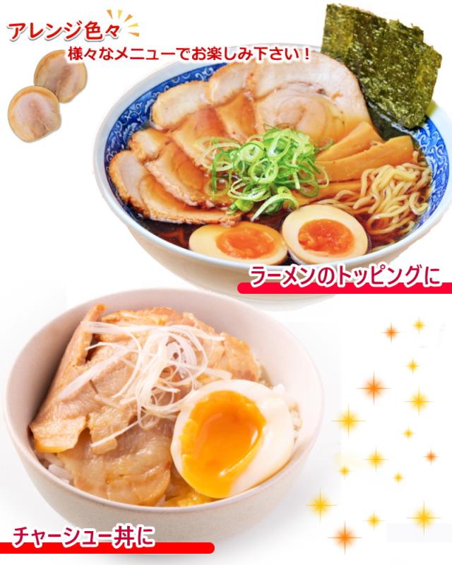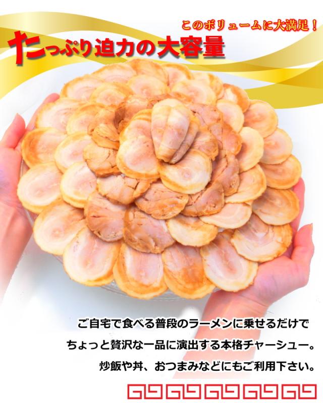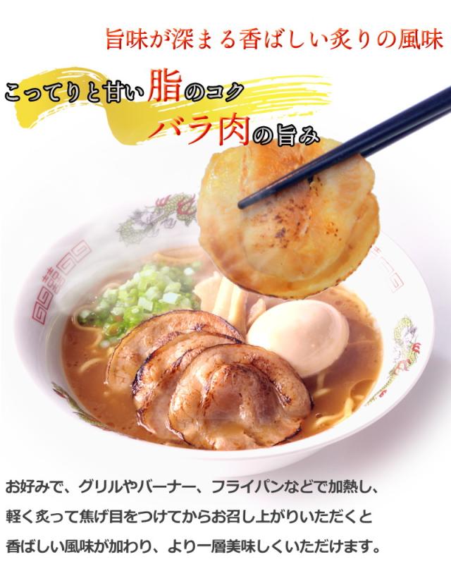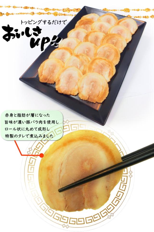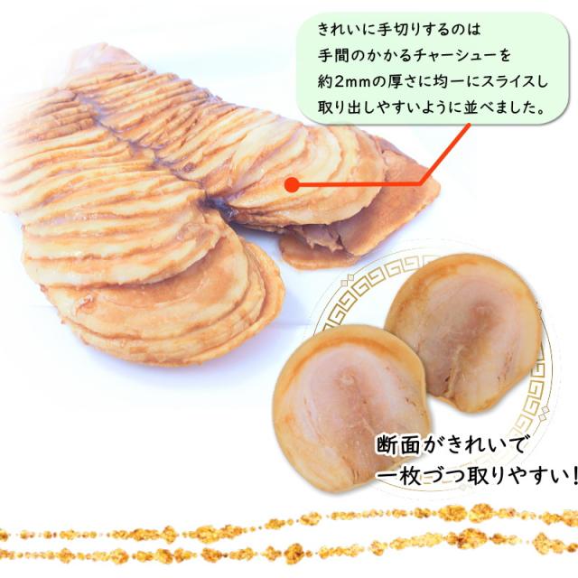 豚バラ肉を特製タレでじっくりと味付けたジューシーな焼豚を、厚さ2mmにカットしてあります。