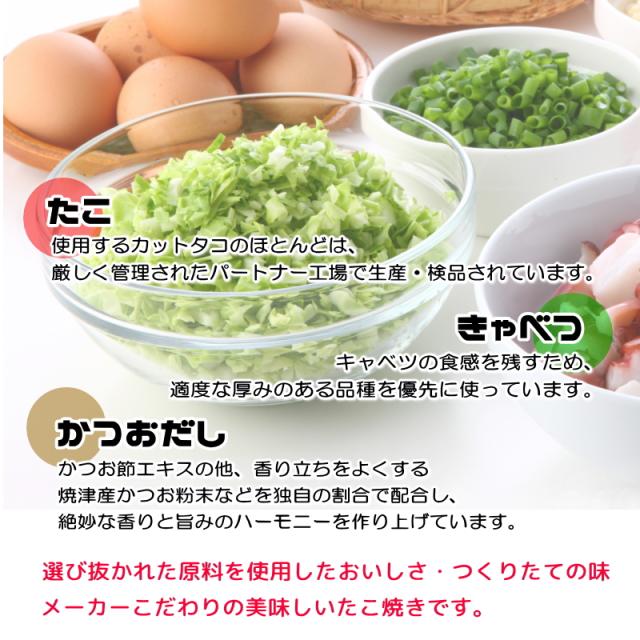 【原材料】小麦粉(国内製造)、たこ、キャベツ、ねぎ、揚げ玉、風味調味料、鶏卵、