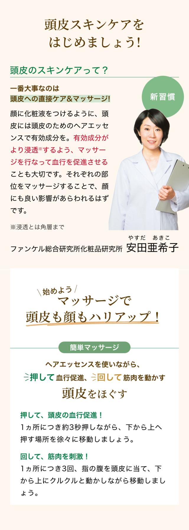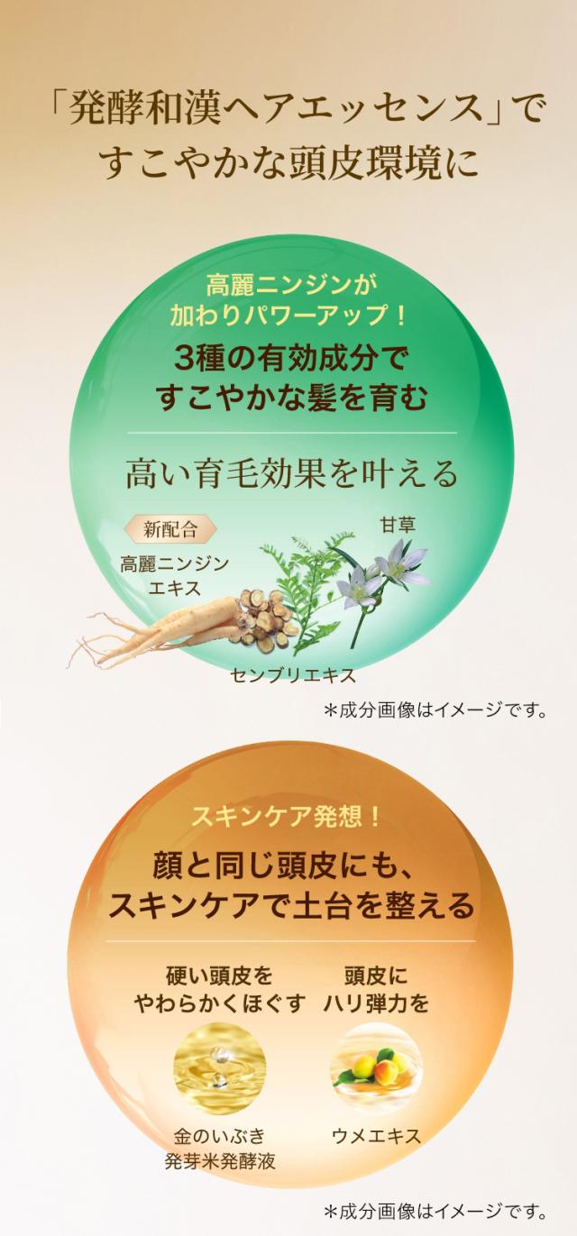 肌と頭皮はつながっているからこそ、頭皮にもうるおいと弾力が大切であるという事実に着目。発毛・育毛を活性化する「高麗ニンジンエキス」など 3 種の有効成分のほか、頭皮をほぐし*、うるおい・ハリをあたえる「金のいぶき発芽米発酵液」や「ウメエキス」を配合。