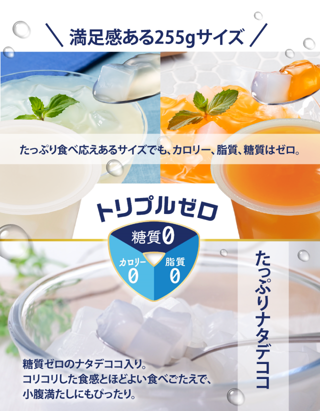 水分と食物繊維からなる糖質ゼロの健康素材ナタデココ入り。たっぷり食べられて、満足感ある255g。