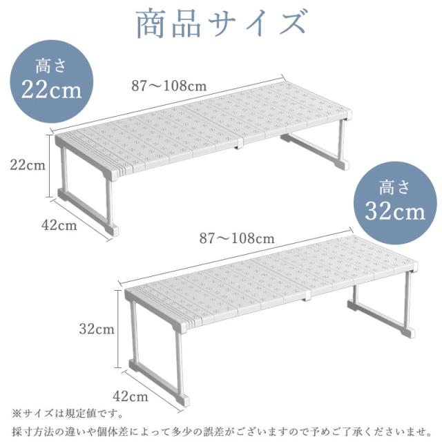 伸縮棚 積み重ね 幅 87-108cm 高さ 22cm 32cm 奥行 42cm 伸縮ラック クローゼット 押入れ 通気性 収納 防水 丈夫 頑丈 整理棚 シンク下 ワイド 空間活用 省スペース キッチンラック 空きスペース 隙間 新生活 すき間 衣替え スリム 長さ調整 押し入れ キッチン 玄関 脱衣所
