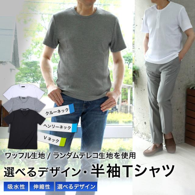半袖Tシャツ メンズ 夏 プルオーバー クルーネック ヘンリーネック Vネック ビジネス カジュアル スポーツ ビズカジ テレワーク ワッフル生地 リブ生地