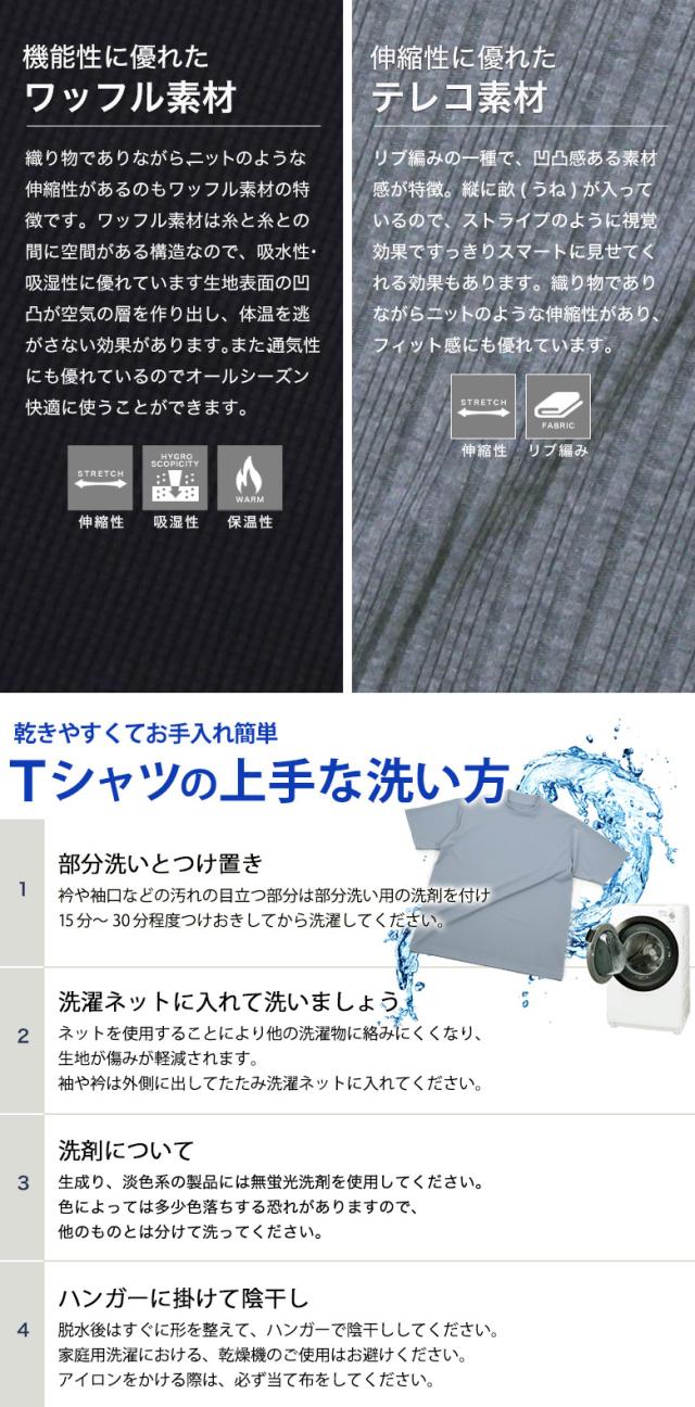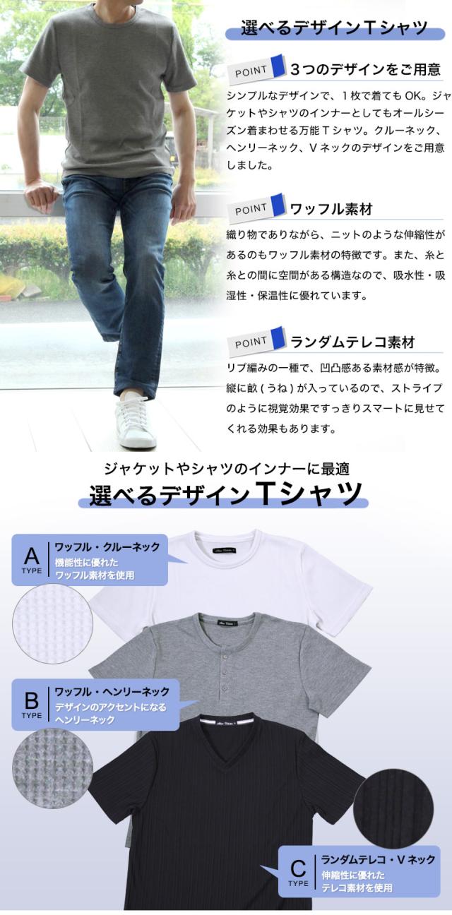 | 【選べるデザイン・半袖Tシャツ】 シンプルなデザインで、1枚で着てもOK。ジャケットやシャツのインナーとしてもオールシーズン着まわせる万能Tシャツです。伸縮性・吸湿性・保温性に優れた肌触りの良いワッフル素材と、伸縮性とフィット感に優れたランダムテレコ素材の2種類をご用意。襟のデザインも、クルーネック・ヘンリーネック・Vネックの3種類を揃えています。デニムに合わせてカジュアルに。また、ジャケットと合わせてビジネスやリモートワークにも。オンオフ問わずご活用いただけます。 |