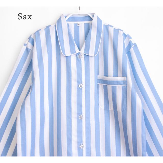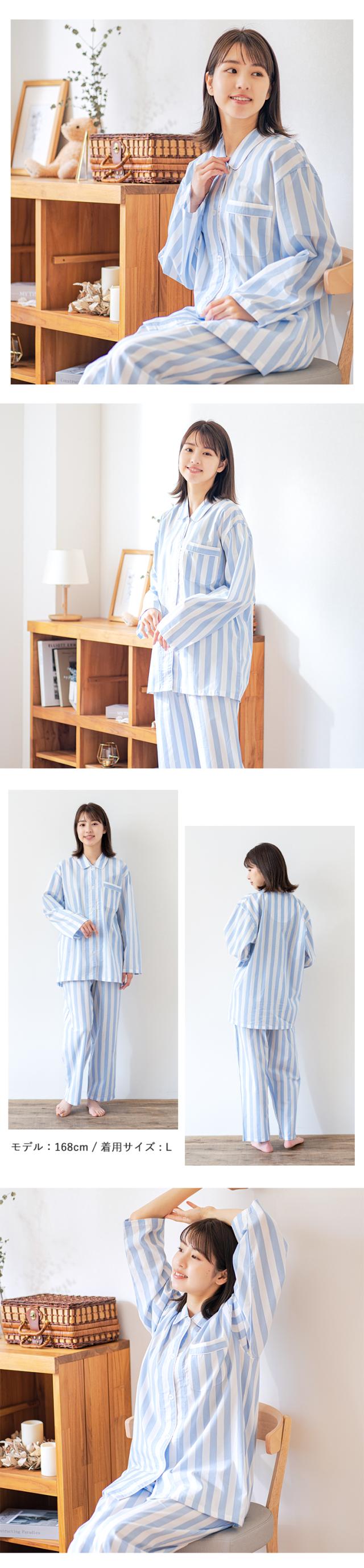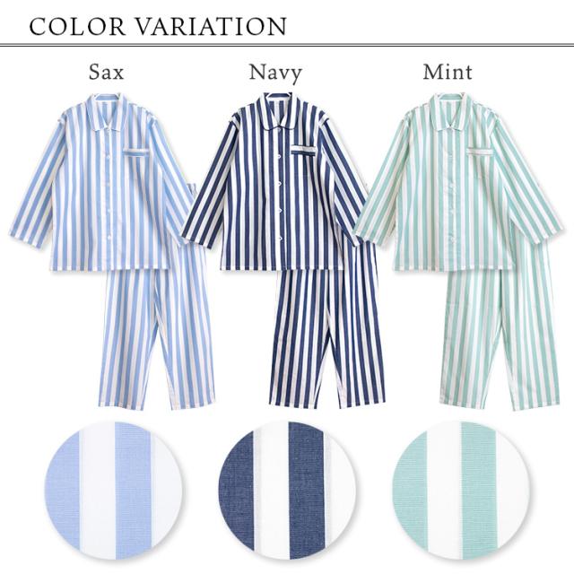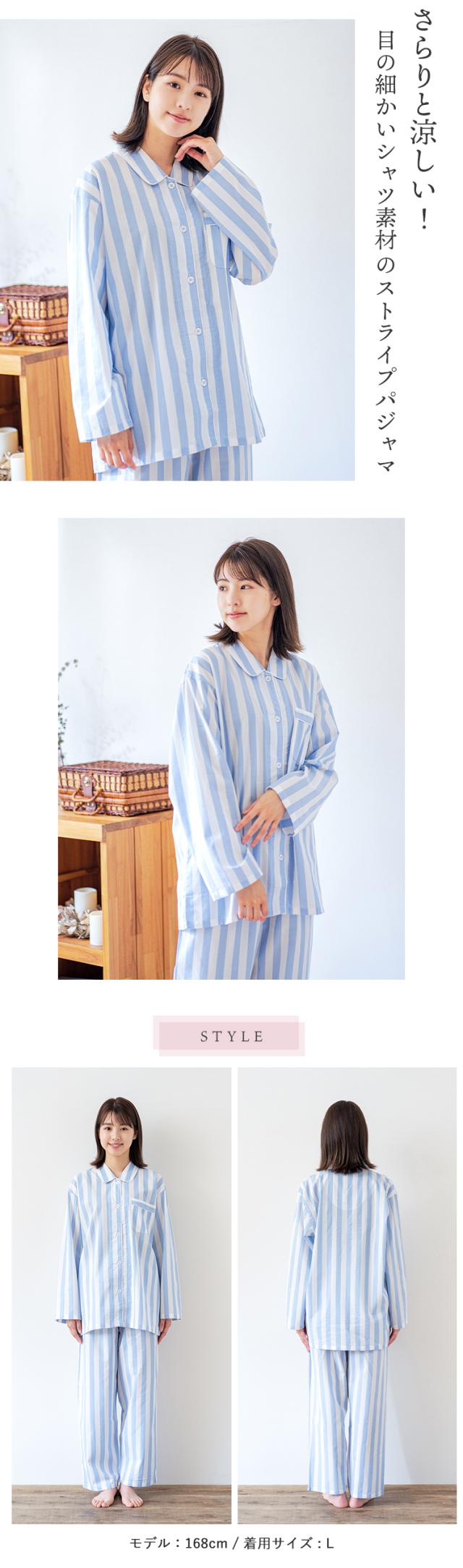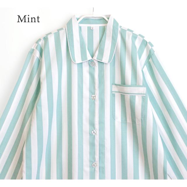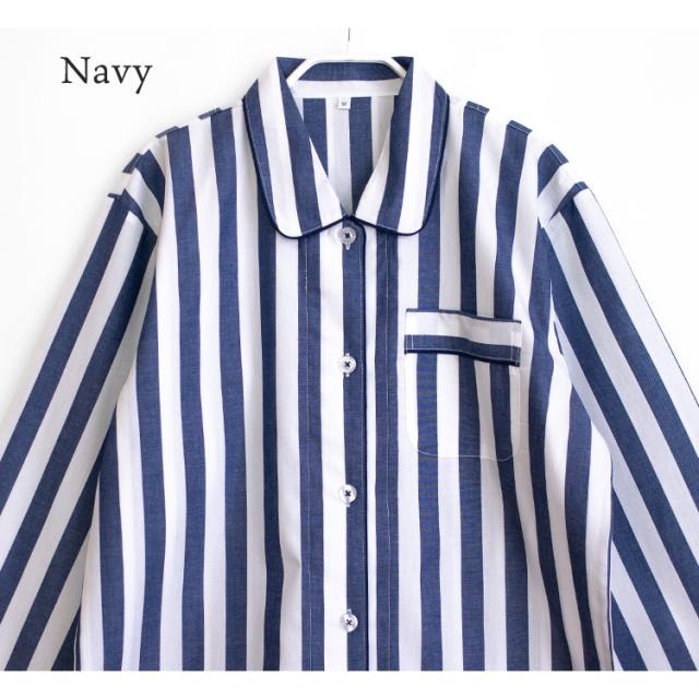 パジャマ レディース 綿100% 長袖 春 夏 前開き ボタン シャツ ストライプ ネイビー ミント サックス S M L LL 3L 先染め おそろい