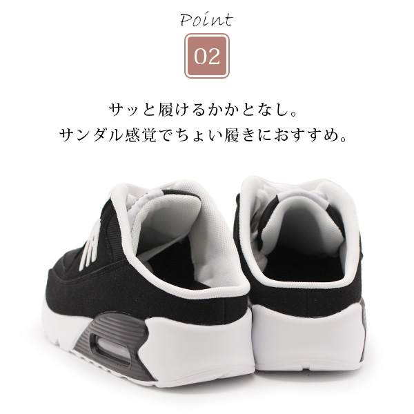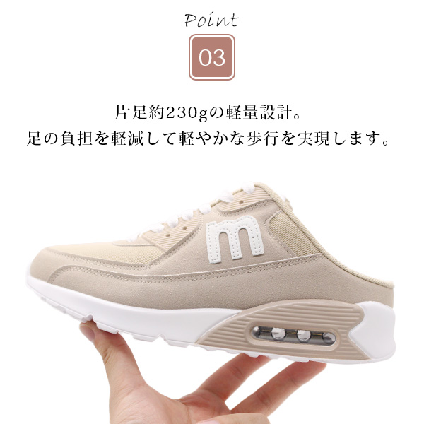 かかとのエアークッションが歩行時の足への負担を和らげます。サッと履けるかかとなし。サンダル感覚でちょい履きにおすすめです。片足約230gの軽量設計。足の負担を軽減して軽やかな歩行を実現します。シンプル&おしゃれなデザイン。幅広いコーデに合わせやすい仕上がりに。