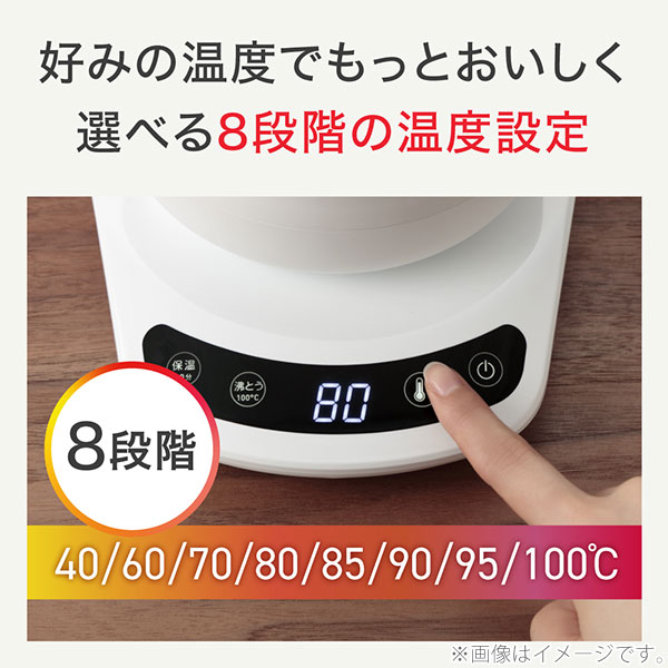 倒れてもお湯がこぼれにくい、8段階の温度コントロールタイプの電気ケトル。