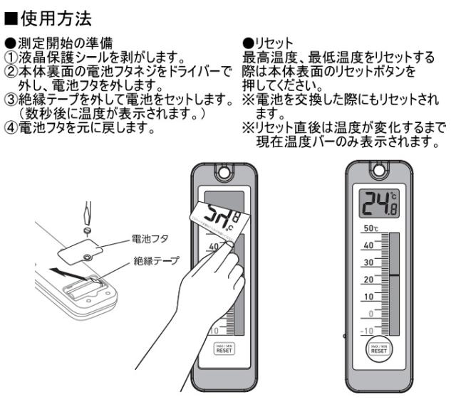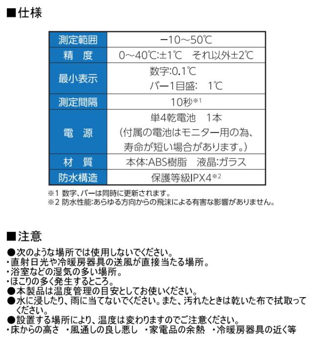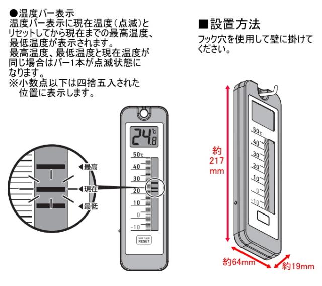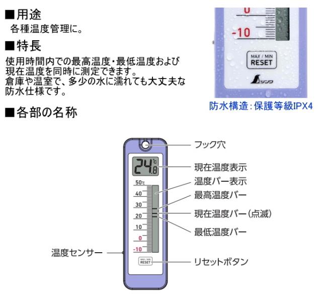 | 特徴 | デジタル数字と温度バーのダブル液晶表示です。温度バーは現在温度・最低温度を一度に見ることができます。 倉庫や温室で、多少の水に濡れても大丈夫な防水仕様です。 視野角が広く、明るさ、映り込みにくさにこだわった液晶表示です。 感度の良い温度センサーで、10秒毎に更新します。 |