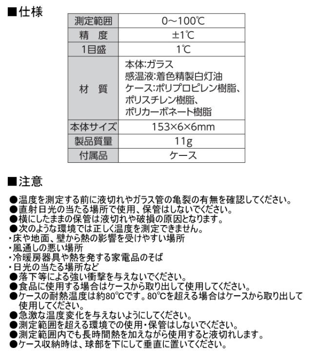 | 材質 | 本体:ガラス 感温液:着色精製白灯油 ケース:ポリプロピレン樹脂、ポリスチレン樹脂、ポリカーボネート樹脂 |
