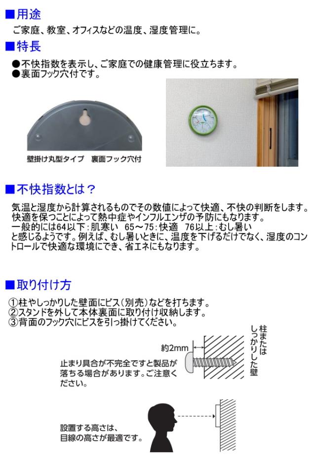 温湿度・不快指数計 R-2 丸型 15cm グリーン 70500 温不快指数 室内 熱中症 インフルエンザ 予防 壁掛け