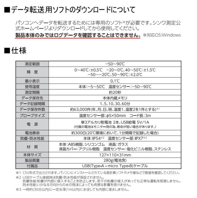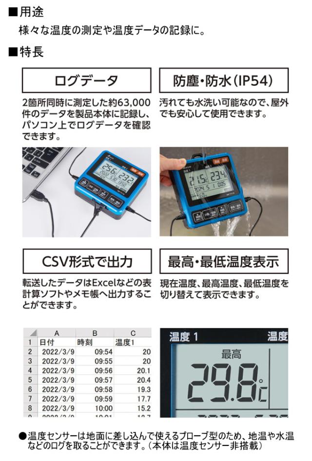 | 特徴 | 2箇所同時に測定した約63,000件のデータを製品本体に記録し、パソコン上でログデータを確認できます。 ※CSV形式で出力されます。パソコンにインストールされている表計算ソフトやメモ帳などで数値を確認してください。 現在温度と最高・最低温度の表示を切り替えできます。 温度センサーは地面に差し込んで使えるプローブ型のため、地温や水温などのログを取ることができます。(本体には温度センサー非搭載) 防塵・防水性能 本体はIP54、温度センサー部はIPX7です。 ■データ転送用ソフトのダウンロードについて パソコンへデータを転送するためには専用のソフトが必要です。 シンワ測定公式ホームページよりダウンロードしてから使用してください。 (対応OS:Windows) ※製品本体のみではログデータを確認することはできません。 ※沖縄、離島へはお届けできません。 |
