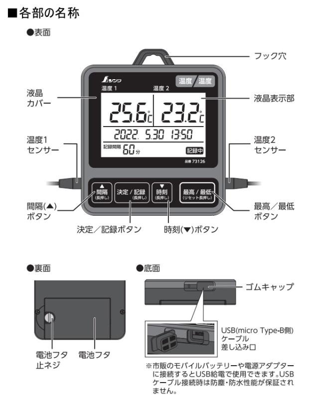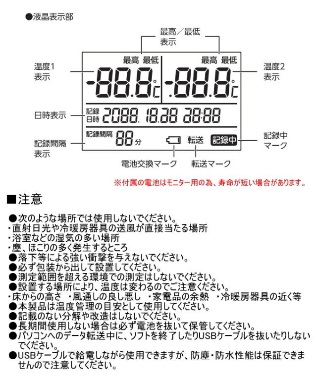 | データログ機能 | データ保存先:本体内蔵メモリ データ記録間隔:1、5、10、30、60分 データ保存件数:約63,000件(年、月、日、時、温度1、温度2を1件とする) |