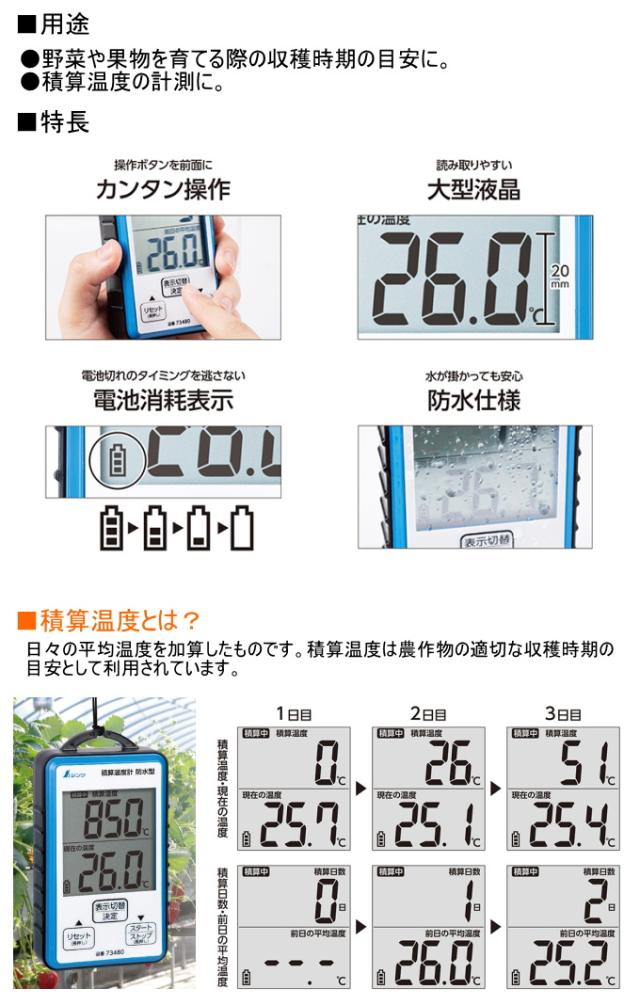 積算温度計 防水型 73480 温度管理 野菜 果物 収穫 目安 積算温度 防塵 防水 軽量 コンパクト フック穴付 スタンド