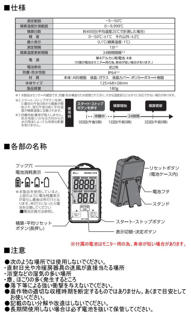 | 積算温度更新間隔 | 24時間間隔 ※スタート・ストップボタンを押した最初の午前0時から積算が開始され、翌日午前0時に平均温度が積算温度に加算されます。 |
