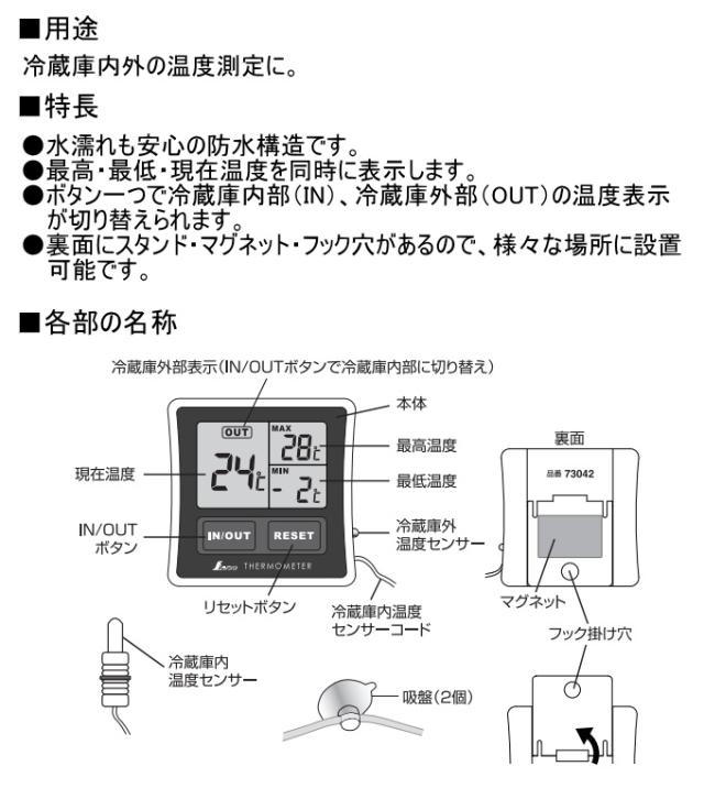 | 特徴 | 冷蔵庫内外の温度を切り替え表示できます。 最高・最低・現在温度を同時に表示します。 水濡れも安心の防水仕様です。 スタンド・マグネット・フック穴があるので、様々な場所に設置可能です。 |