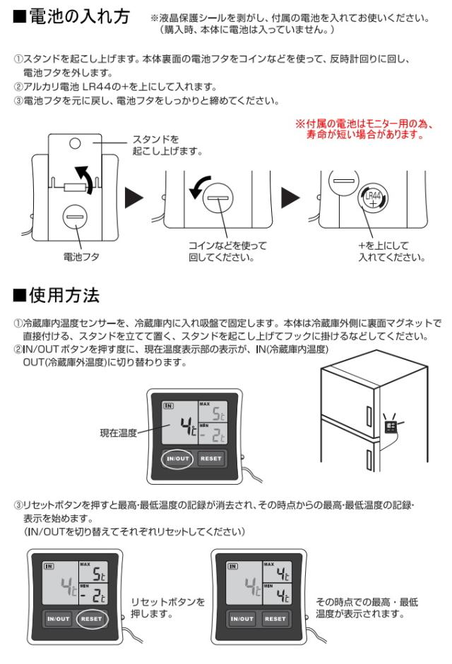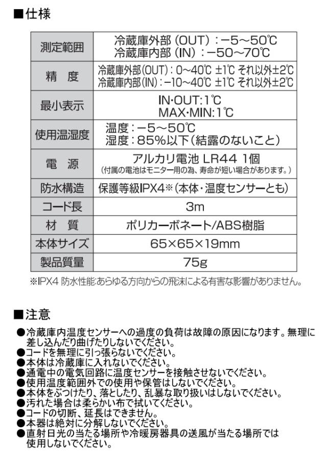 | 測定範囲 | 冷蔵庫外部(OUT):-5〜50℃ 冷蔵庫内部(IN):-50〜70℃ |