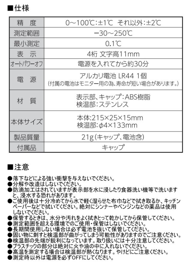 | 特徴 | 油の温度や食材の中などの温度測定に。 ON/OFFスイッチの操作だけで温度が測れます。 検温部が長いので安全に使用できます。 防滴構造です。 ピンク・グリーンの2色からお選びください。 |