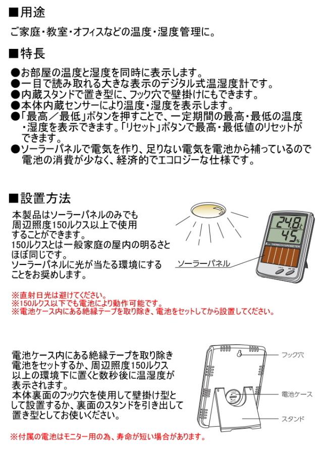 | 特徴 | お部屋の温度と湿度を同時に表示します。 一目で読み取れる大きな表示のデジタル式温湿度計です。 内蔵スタンドで置き型に、フック穴で壁掛けにもできます。 本体内蔵センサーにより温度・湿度を表示します。 「最高/最低」ボタンを押すことで、一定期間の最高・最低の温度・湿度を表示できます。「リセット」ボタンで最高・最低値のリセットができます。 ソーラーパネルで電気を作り、足りない電気を電池から補っているので電池の消費が少なく、経済的でエコロジーな仕様です。 |