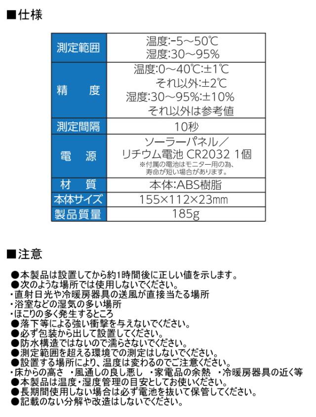 | 電源 | ソーラーパネル(周辺照度が約150ルクス以上の場合はソーラーパネルで駆動、150ルクス以下の場合は電池で駆動します。) リチウム電池CR2032 1個(付属の電池はモニター用の為、寿命が短い場合があります。) |