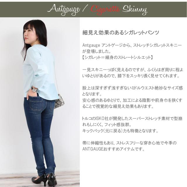 Antgauge アントゲージ ストレッチ ISKO シガレット スキニーパンツ ツールジーンズ (c2018) デニム ジーンズ ストレッチデニム ボトムス ズボン ストレート フィット感 美脚 小尻 キックバック 伸びる ストレッチ 脚細効果 小尻 おしゃれ アーベン カジュアル