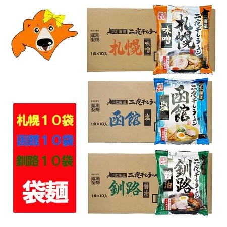 インスタント 袋麺 ラーメン 送料無料 札幌ラーメン 味噌 / 函館ラーメン 塩 / 釧路ラーメン 醤油 セット 各1箱(10袋入) 合計3ケース さっぽろラーメン / はこだてラーメン / くしろラーメン 麺類 ラーメン