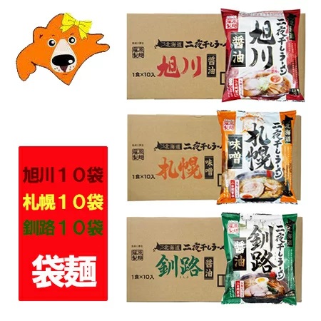 インスタント 袋麺 ラーメン 送料無料 旭川ラーメン 醤油 / 札幌ラーメン 味噌 / 釧路ラーメン 正油 セット 各1箱(10袋入) 合計3ケース あさひかわ ラーメン しょうゆ / さっぽろ ラーメン みそ / くしろ ラーメン しょうゆ 麺類 ラーメン