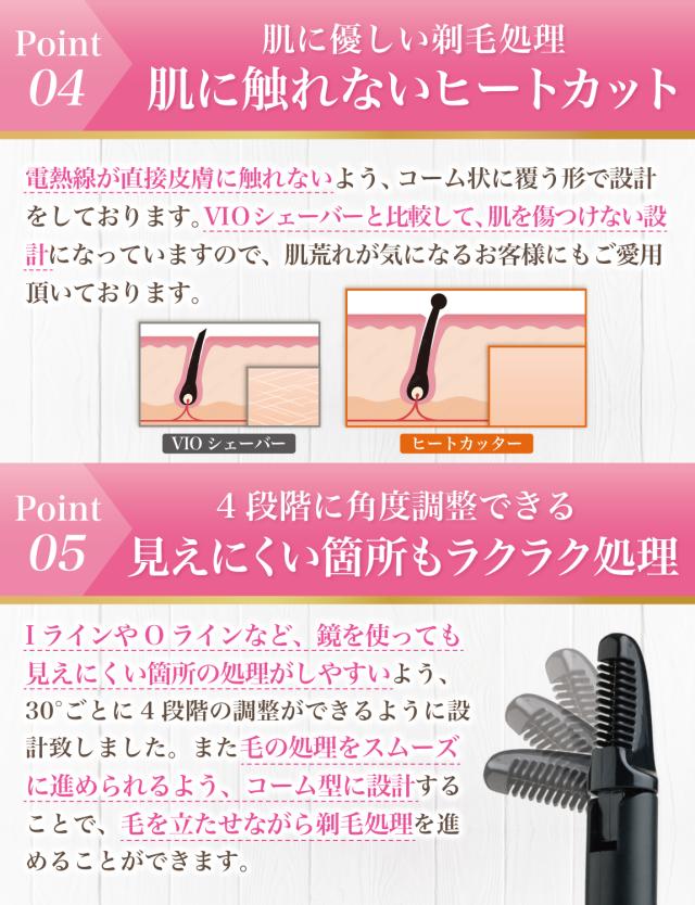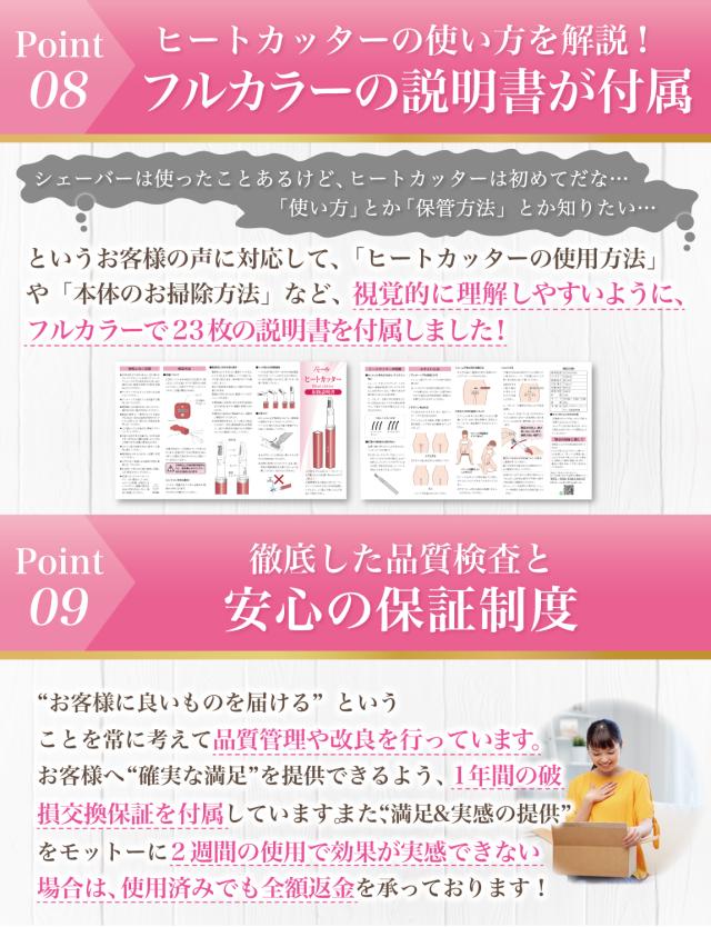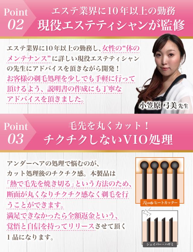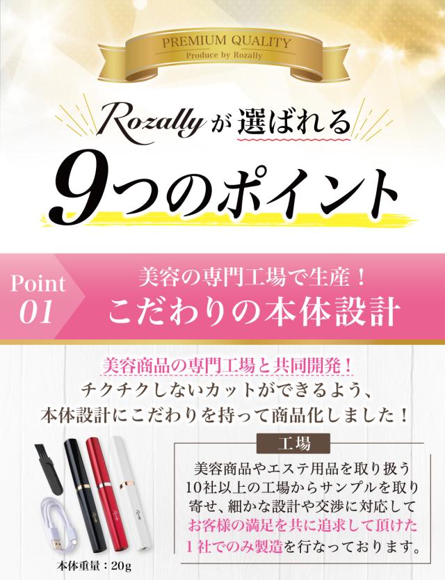 様々なメーカーから” Vライントリマー ”や” VIOシェーバー ”として 女性用シェーバー が販売されていますが、 Rozallyの ヒートカッター は”こだわり”が一味違います。 デリケートゾーン から Vライン の 除毛 について、 お客様からの様々な悩みをヒアリングした上で、 シェーバー アイテムをメインに取り扱っている 10社以上の工場からサンプルを取り寄せ、 「チクチクしないこと」や「肌を傷つけない」の形状を 一緒に試行錯誤して頂けた1社に絞って発注を行なっています。 また安全第一の設計で やけど防止 の機能と 静音 設計も採用させて頂きました。 |