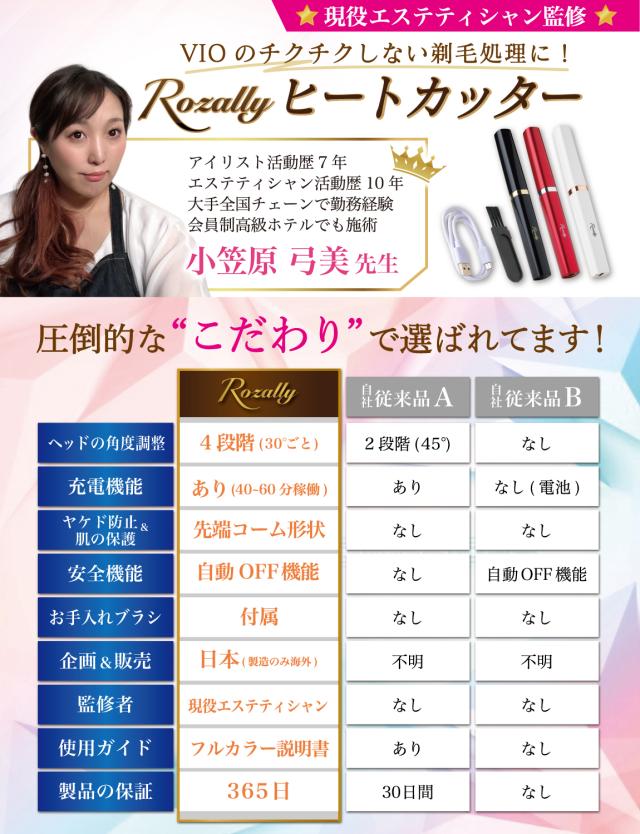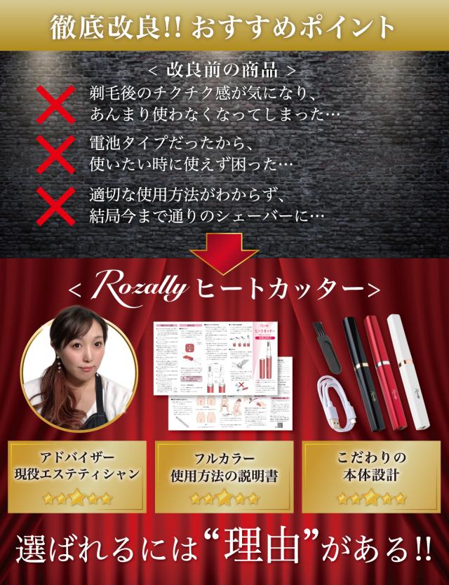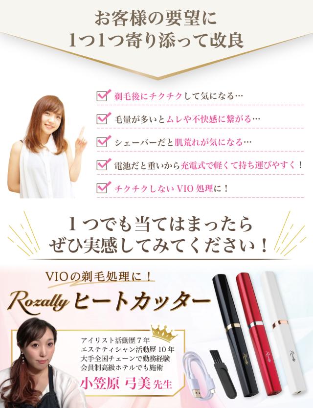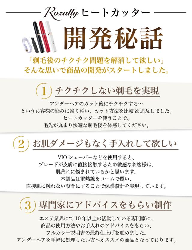 Rozally ヒートカッター がついに正式販売開始。 アンダーヘア の ムダ毛処理 の 女性用シェーバー として今注目されている usb充電 タイプ の” ヒートカッター ”です。 VIOシェーバー では剃毛後にチクチク気になる…というお悩みの方へ アンダーヘアーケア を快適にするため開発させて頂きました。 企画&設計では【現役エステティシャン】の先生からアドバイスをもらい、 分かりやすい取扱説明書を添えて企画&開発しました。 |